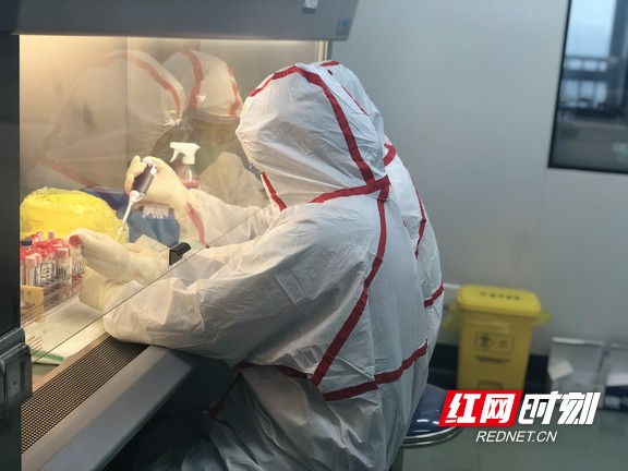 作为全市公共卫生检测检验中心,长沙市疾控中心不仅承担着全市新冠病毒核酸检测“一锤定音”的确诊重任,还肩负着对全市有检测资质的医疗机构进行新冠病毒核酸检测技术指导的任务。随着全市疫情进展,病毒检测组任务日益繁重,最终,主动请缨参战的16名检验专技人员,排成“四班倒”24小时值守,确保实验室第一时间出具检测结果,为控制疫情蔓延和病患救治争分夺秒。目前已累计检测样品3264份,单日最大检测量达308份。