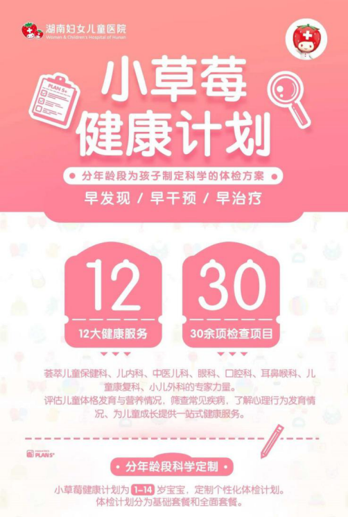 针对家长们对孩子成长发育问题的困惑,湖南妇女儿童医院特推出小草莓健康计划,按照儿童生长发育规律及特点,分年龄段为1-14孩子制定科学的体检方案,涵盖12大健康服务,30余项检查项目。