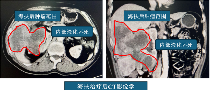 12月16日完成无创海扶治疗后,许先生的腹痛症状已经得到一定缓解。更令人欣喜的是,CT复查结果显示,肿瘤内部已经大部分出现液化、坏死,肿瘤的整体侵犯及浸润情况也较术前得到改善。海扶治疗的结果,也给手术团队带来了巨大的信心。