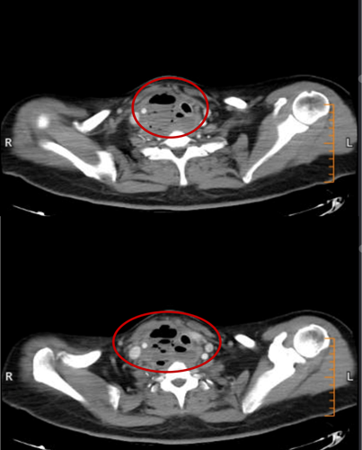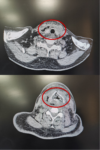 2月15日、2月20日,当长沙沉浸在辞旧迎新的欢声笑语中,两位病情凶险的颈部深部脓肿患者先后被推入耳鼻咽喉头颈外科。他们都有多年糖尿病病史,春节期间饮食不规律、作息紊乱、血糖波动大,让原本隐匿的感染如野火般迅速蔓延。其中一位患者的感染已突破颈部间隙,如藤蔓般向下侵入纵隔区域——那里是心脏、大血管、气管的“交通枢纽”,是人体最脆弱的生命禁区之一。CT影像上,脓肿中密布的气腔像一个个危险的信号,气管严重受压,每一次呼吸都变得艰难。而临床研究数据表明,颈深部脓肿并发下行性纵隔炎,病死率为40%~70%。患者的生命,危在旦夕。