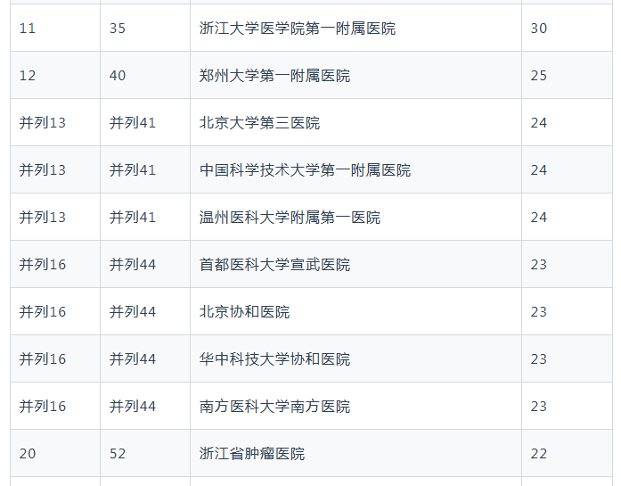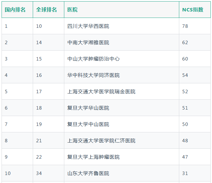 在Cell、Nature、Science三大顶刊及其核心子刊的发文全球前100名医院中,中国有7家医院(四川大学华西医院、中南大学湘雅医院、中山大学肿瘤防治中心、华中科技大学同济医院、上海交通大学医学院瑞金医院、复旦大学华山医院、复旦大学中山医院)进入全球前20名,占据了全球前20名的三分之一席位。