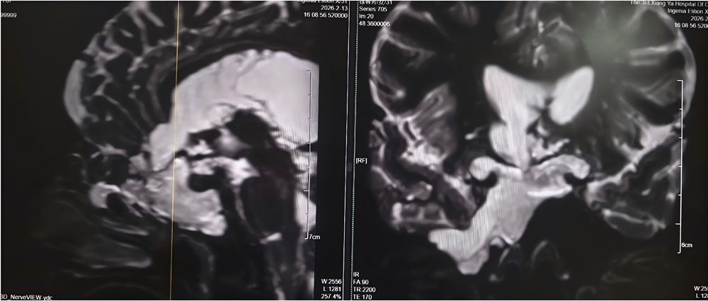 4年前,刘女士开始出现鼻腔流血、反复清水样流液,并伴有嗅觉减退。期间,她曾辗转多家医院及诊所就诊,医护人员多以“炎症”为病症进行对症治疗,但症状始终未得到根本改善。此后,刘女士多次出现发热伴鼻腔流液的情况,却一直未能明确病因。2026年2月11日,刘女士突发高热,体温超过39℃,并出现神志模糊的症状,当地医院紧急诊断后,确诊其为“脑脊液鼻漏合并颅内感染”,并下达了病危通知。危急时刻,家属紧急将刘女士转送至湘雅三医院功能神经外科求治。