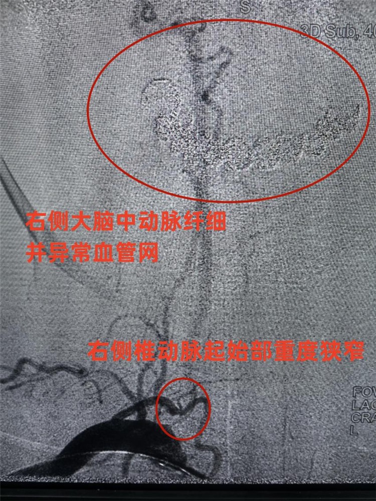 入院后,医院完善头颅MRI平扫+SWI+DWI等检查,显示胼胝体膝部、右侧额叶多发急性腔隙性脑梗塞灶,右侧枕叶脑软化灶等。神经内科团队经研究,决定为患者行脑血管造影(DSA)检查。DSA结果显示:左侧椎动脉V1段闭塞并侧枝形成,右侧大脑中动脉纤细并异常血管网形成(烟雾病),右侧椎动脉起始部重度狭窄。