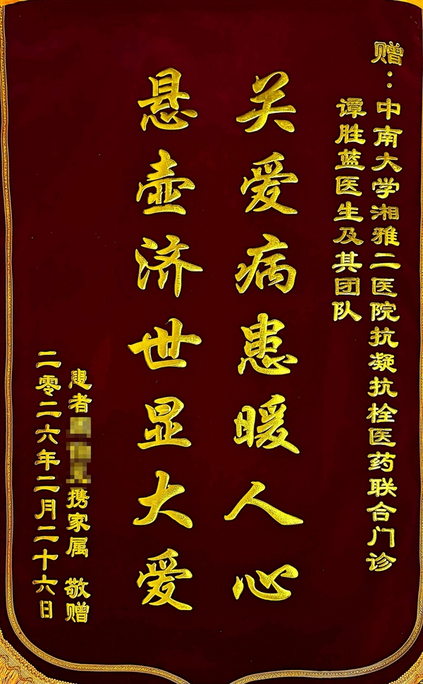 红网时刻新闻3月5日讯(通讯员 陈璐)近日,中南大学湘雅二医院抗凝抗栓医药联合门诊收到患者赠送的锦旗,感谢四年来凭借专业诊疗与责任担当,为其缓解病痛、守护健康。