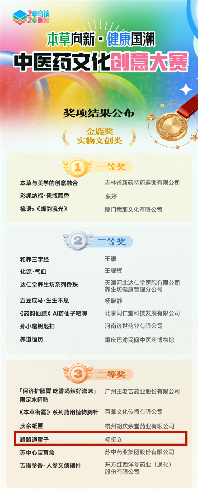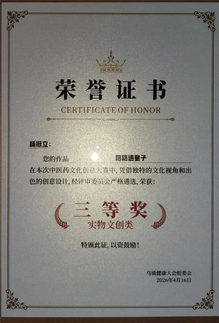长沙泰和医院中医科杨挺立医生独立原创设计的中医药科普IP“路路通童子”,凭借独特的文化视角与出色的创意设计,从众多参赛作品中脱颖而出,荣获中医药文化创意大赛实物文创类·金鹿奖三等奖。