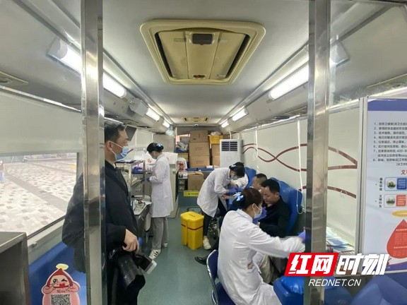 在医务人员的指引下,参与献血的多名党员干部和青年志愿者依次进行献血登记、量血压、验血、上车采血等程序。