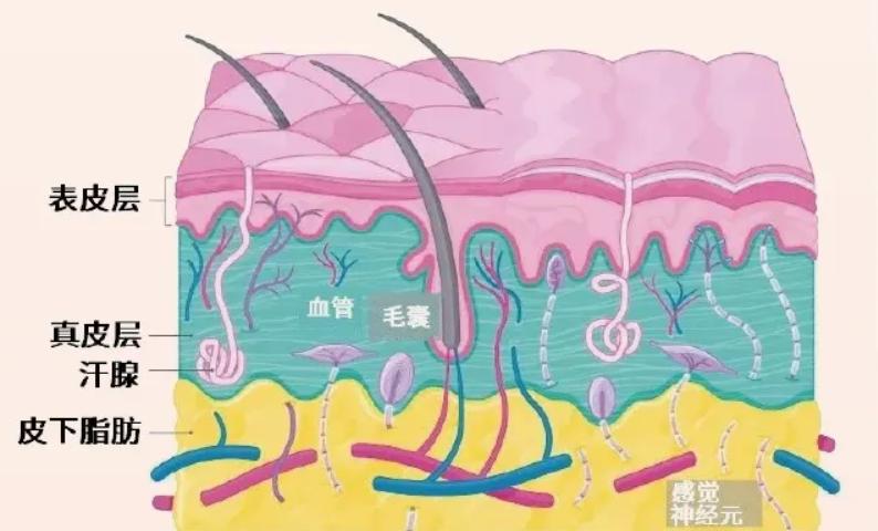 不管是哪个位置的皮肤,从结构上来看,都可分为3层:表皮层、真皮层和皮下脂肪。