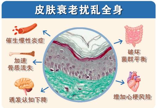 皮肤既是系统性衰老的“显示器”,又能通过DNA损伤、端粒缩短、慢性炎症等皮肤源性信号,“指挥”加速整体衰老进程。
