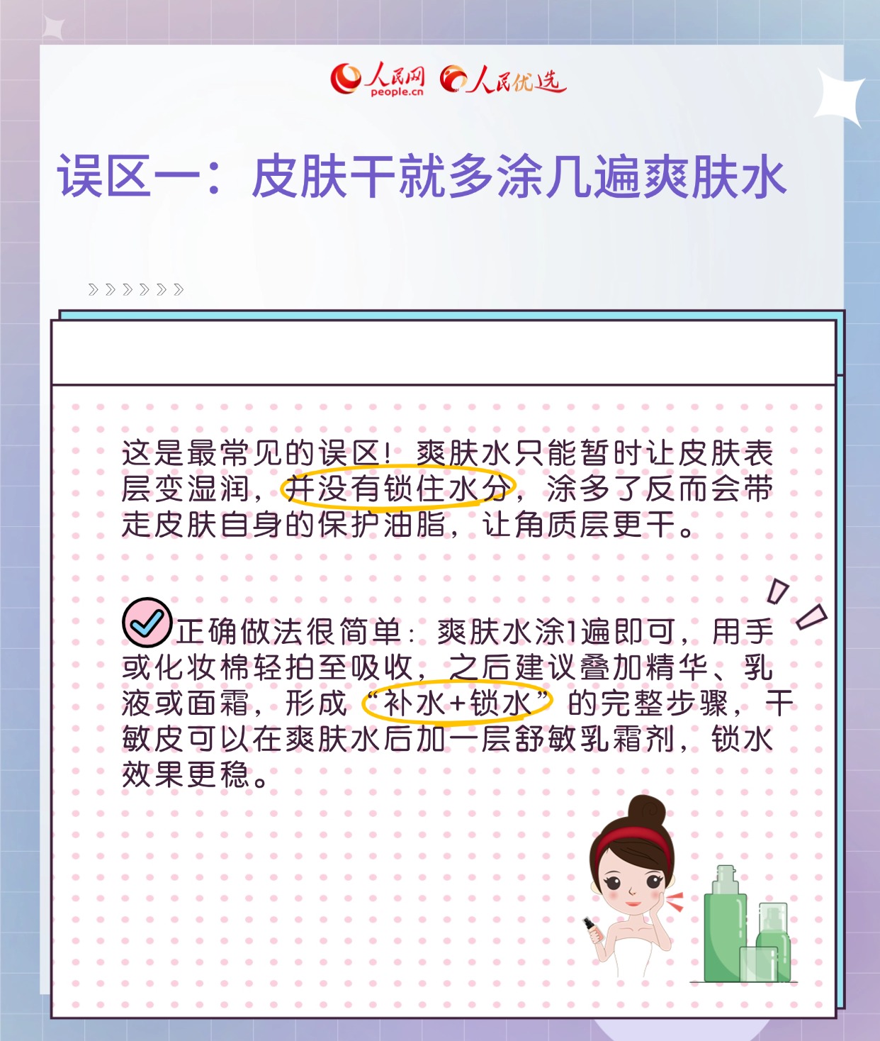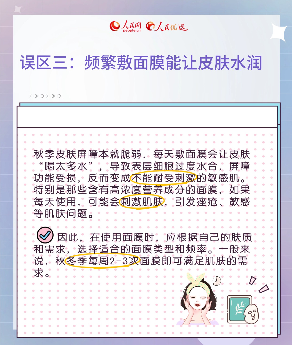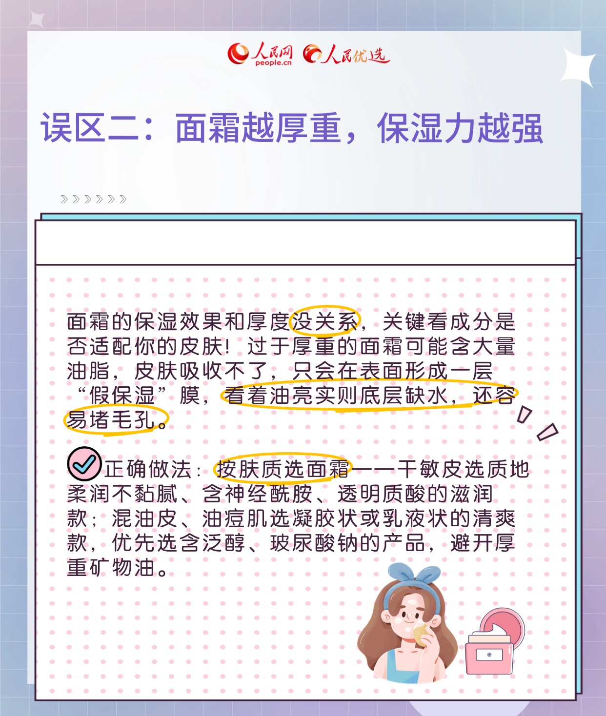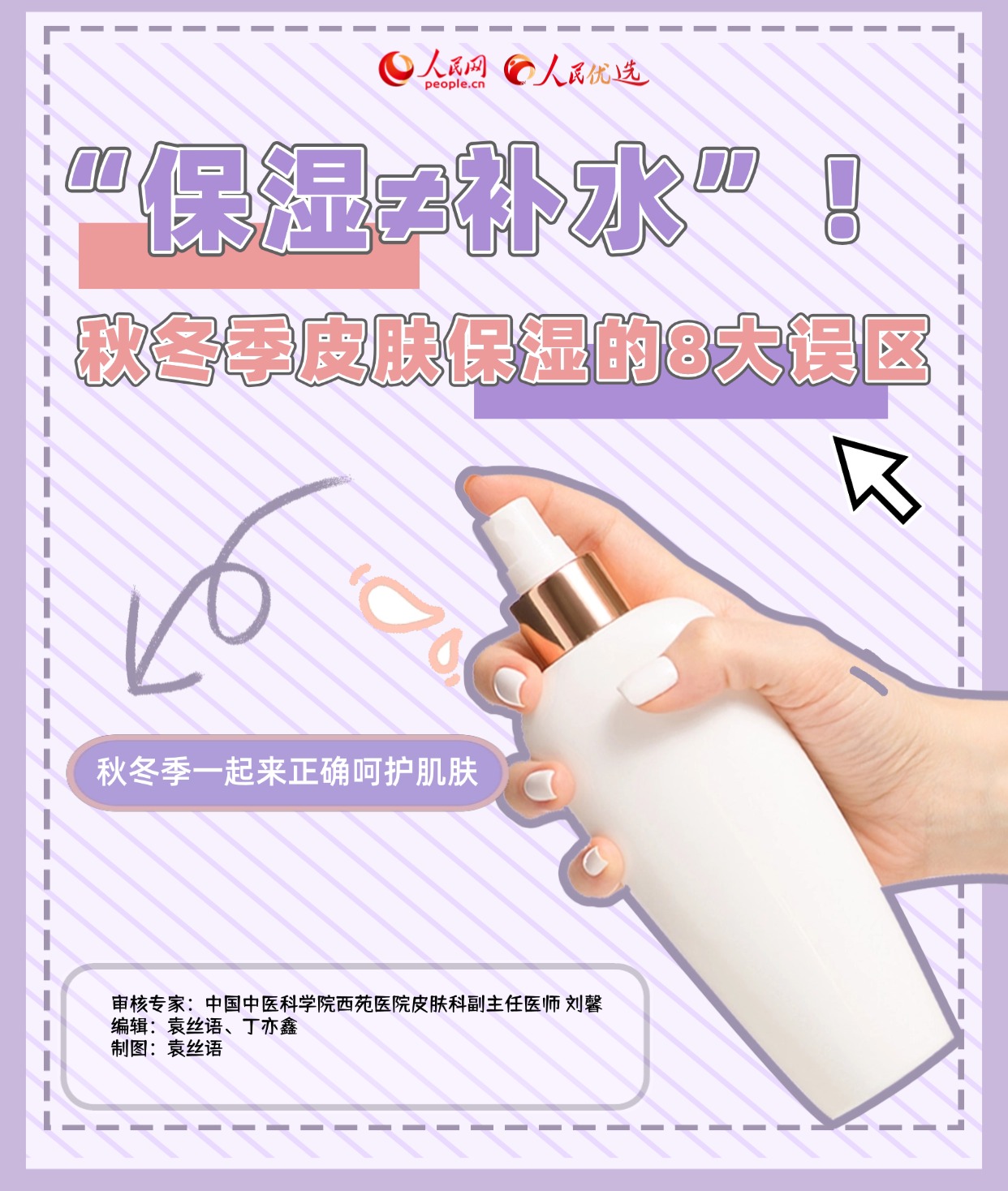 时刻新闻 —分享— 冬季皮肤干燥、紧绷甚至脱屑皲裂,其实是气温下降、空气湿度变低导致皮肤水分快速蒸发的正常现象。很多人急于补水保湿,却因方法不当效果不佳。本期《人民优选来了》,为你梳理下面8个秋冬护肤常见误区,快看看你有没有中招! 来源:人民网 编辑:戴丹