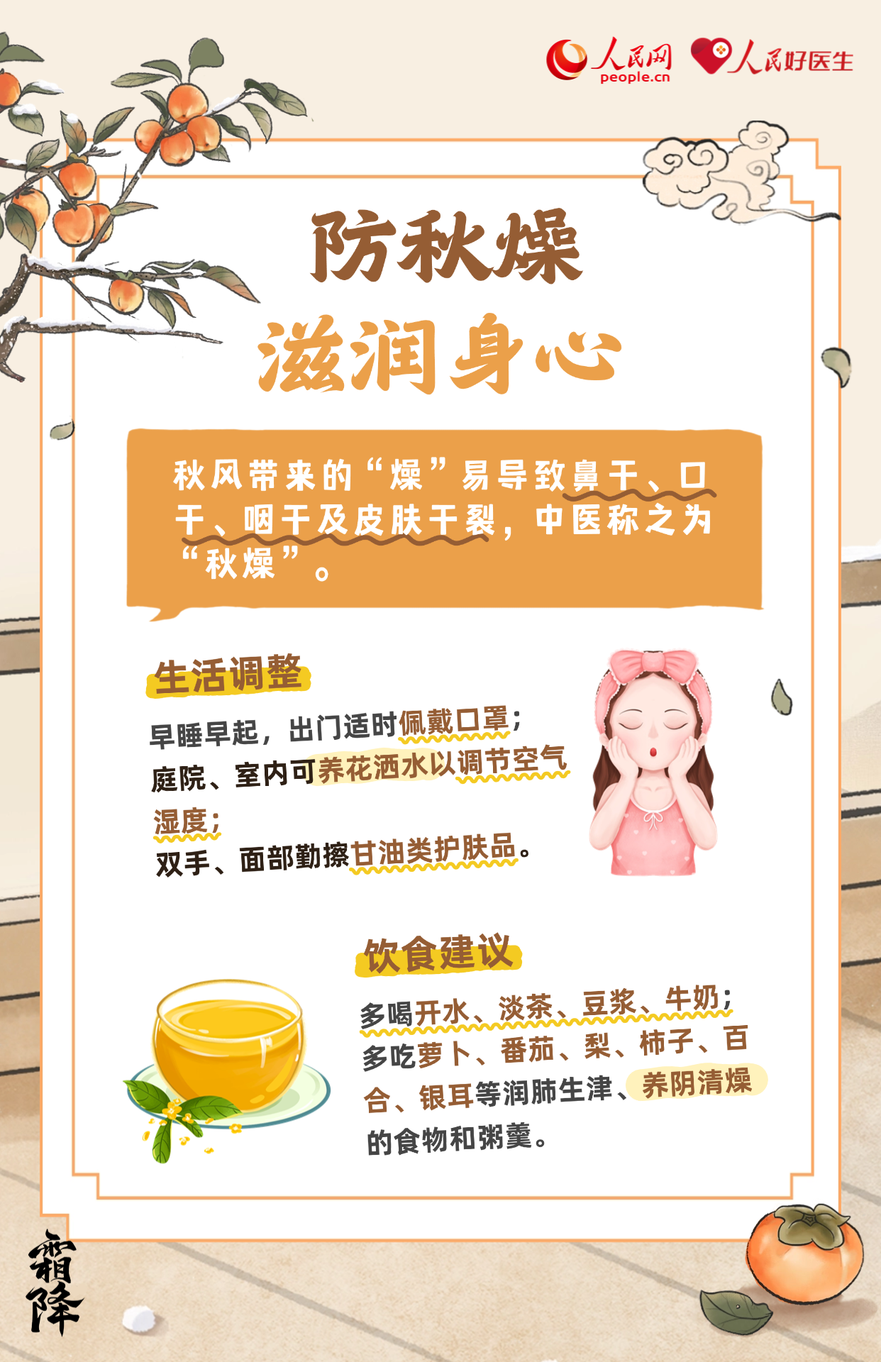 霜降,是二十四节气中的第十八个节气,也是秋季最后一个节气。气温骤降、昼夜温差大。养生当以“防寒润燥,滋阴温阳”为重点,此时节要做好养生保健,无论起居养生还是运动调养都应谨慎,湖北省中医院治未病中心主任医师杨帆为大家带来深秋养生攻略。