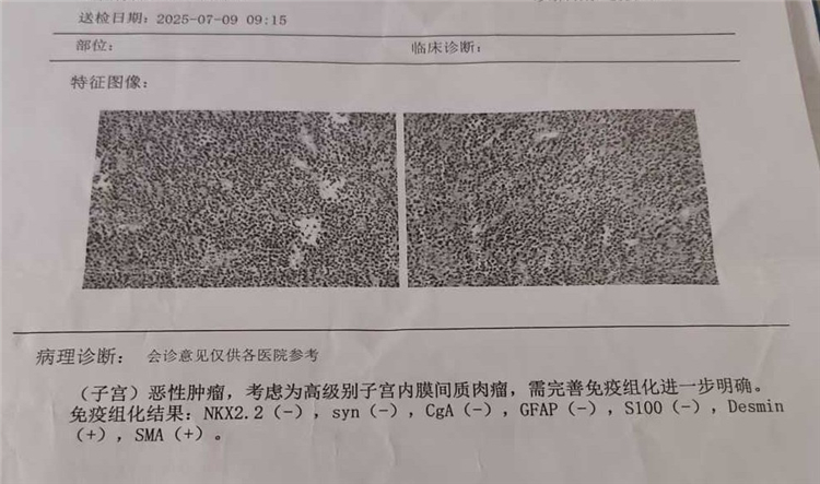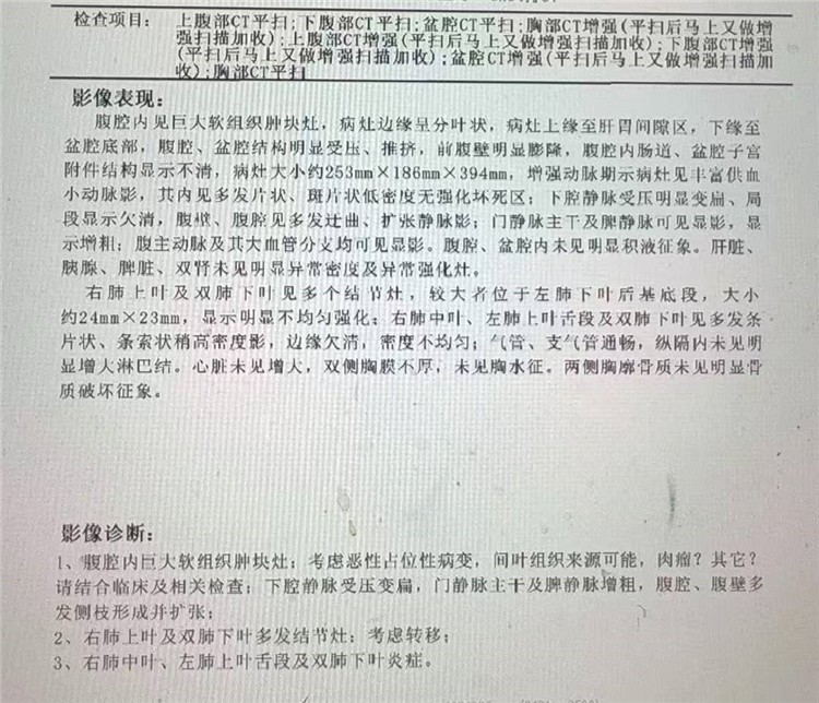 47岁的周女士(化名)去年曾接受妇科子宫内膜间叶组织肉瘤手术。三个月前,她出现腹胀、食欲不振、乏力等症状,腹部迅速膨隆。经省内外多家医院检查,CT提示腹腔内有巨大囊实性占位,病理诊断为腹腔转移性子宫内膜间质肉瘤。多家医院因手术难度大、风险高,未予手术治疗。尽管尝试了化疗等对症处理,效果仍不理想,肿瘤持续增大至近40公分。